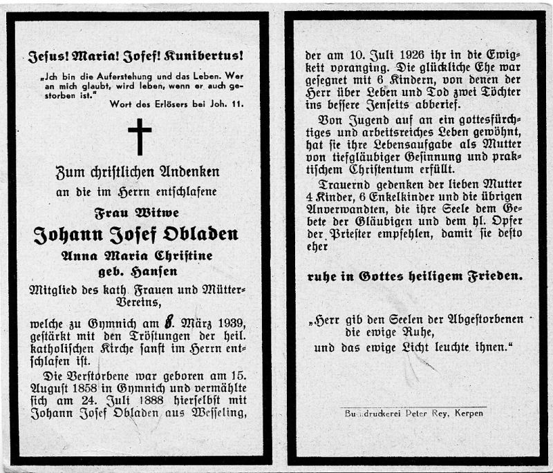 ∞ 24.7.1888 Johann Obladen aus Wesseling, † 10.7.1926; 6 K., davon 2 † |