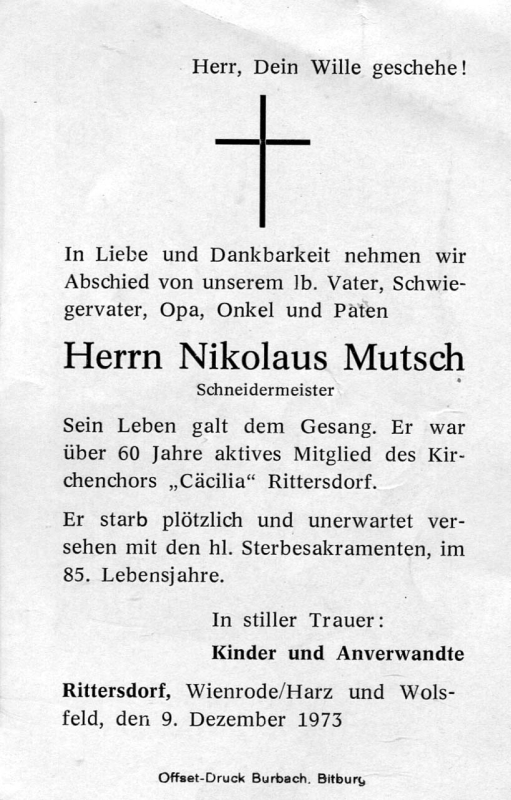 | 85 J.; 60 J. Mitgl. des Kirchenchores Cäcilia in Rittersdorf; Schneidermeister; Kinder; Druck in Bitburg |