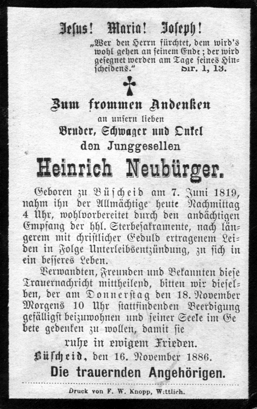 | Junggeselle; längeres Leiden; Unterleibsentzündung; Druck in Wittlich |
