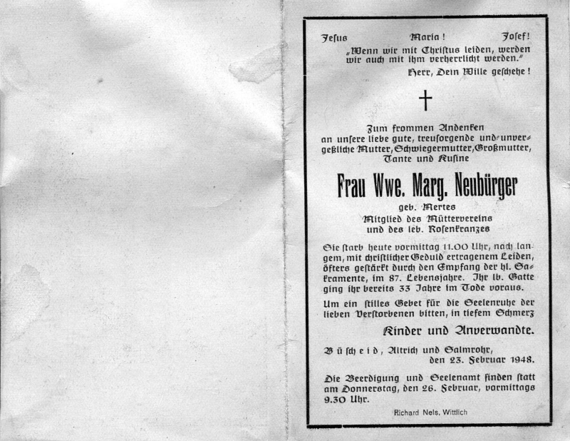 87 J.; ihr Gatte † vor 33 J.; Kinder; Mitgl. Mütterverein u. Lebendiger Rosenkranz; Druck in Wittlich |