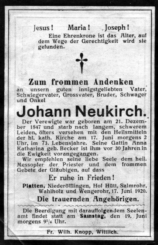 Langes Leiden; Gattin Anna Katharina geb. Becker † vor 30 J.; kinder; Druck in Wittlich |