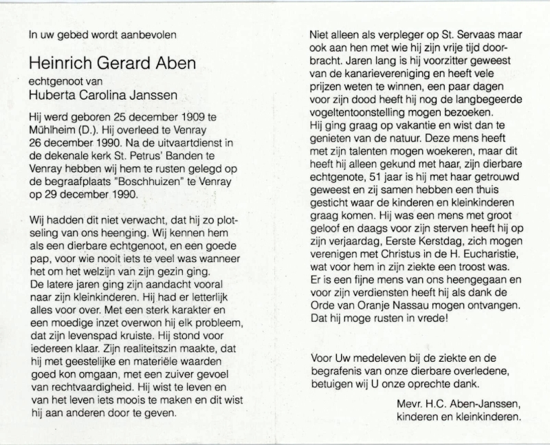 Ehefrau: Huberta Carolina Janssen, Heinrat vir 51 J. |