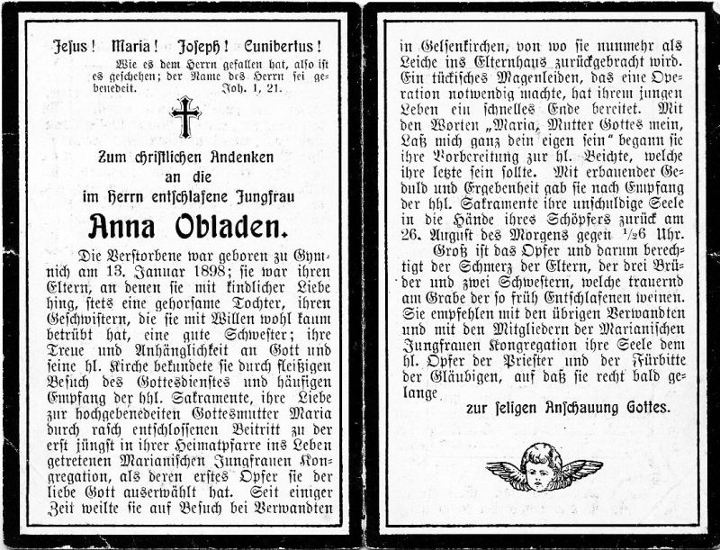 Jungfrau; weilte seit einiger Zeit auf Besuch b. Verwandten in Gelsenkirchen, von wo sie als Leiche ins Elternhaus (in Gymnich) zurückgebracht wurde |