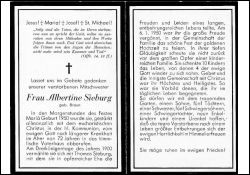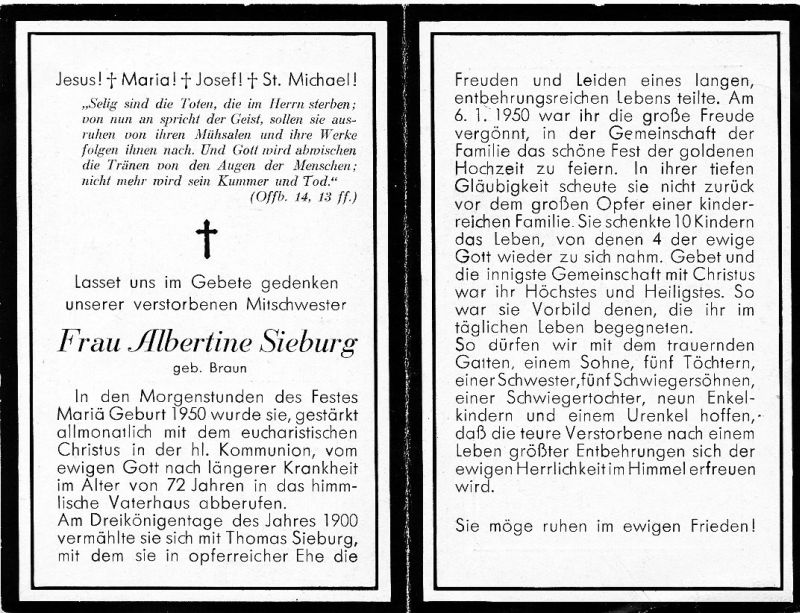 72 J.; ∞ 6.1.1900 Thomas Sieburg; 10 K., davon 4 †; Goldhochzeit 1950; (Buir)