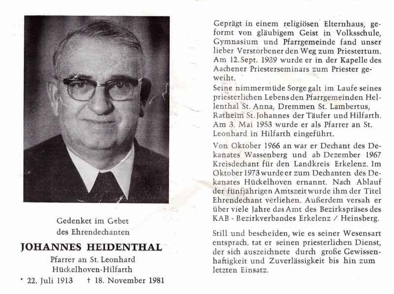 | Priesterweihe 12.9.1939 in Aachen; tätig an St. Anna in Hellenthal, St. Lambertus in Dremmen, St. Johannes d. T. in Ratheim; 3.5.1953 Einführung als Pfarrer an St. Leonhard in Hückelhoven-Hilfarth; 1966 Dechant; 1967 Kreisdechant Kr. Erkelenz; Bezirkspräses der KAB Erkelenz/Heinsberg |