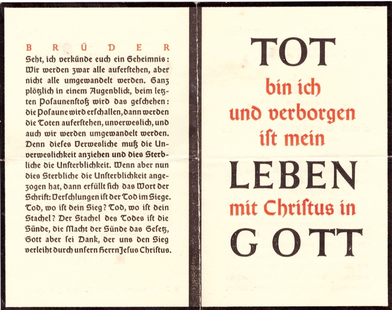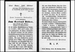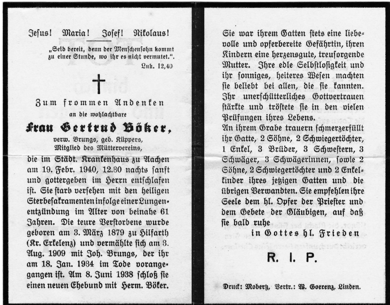 | Lungenentzündung; ∞ 3.8.1909 Johann Brungs, † 18.1.1934; ∞ 8.6.1938 Hermann Böker; 2 überlebende Söhne; Mitgl. Mütterverein |