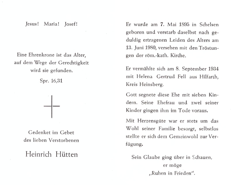 | ∞ 8.9.1934 Helena Gertrud Fell aus Hilfrath, Kr. Heinsberg, †; 7 K., davon 2 † |