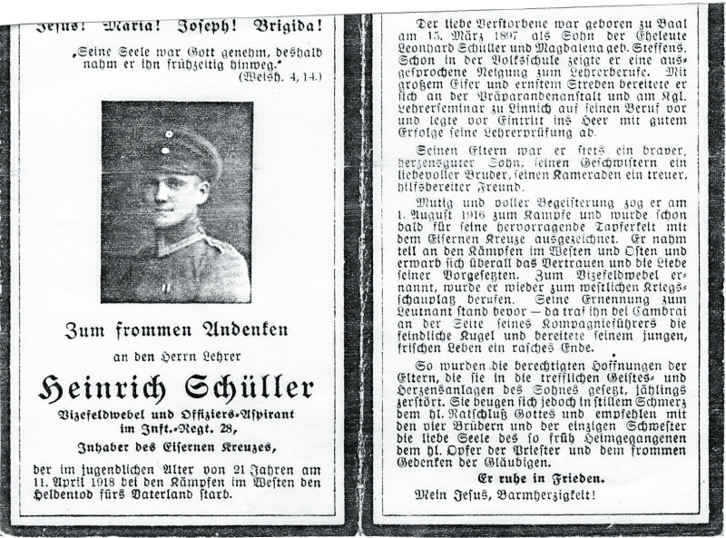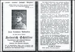 | Gefallener 1. Weltkrieg; Eltern: Leonhard Schüller u. Magdalena geb. Steffens; Ausbildung zum Lehrer an der Präparandenanstalt u. am Kgl. Lehreseminar in Linnich; nach Ablegung der Ledhrerprüfung am 1.8.1916 ins Feld; |