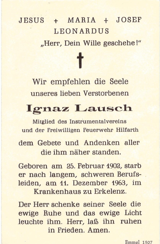 | Mitgl. des Instrumentalvereins u. der Freiwilligen Feuerwehr Hilfarth; Wohnort: Hilfarth; er starb nach langem, schwerem Berufsleiden |