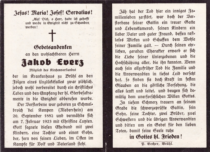 | Tod nach Unfall; Mitgl. Kirchenvorstand; ∞ 7.2.1923 Christine Luyten; 2 K., davon 1 Sohn im 2. Weltkrieg im Osten gefallen; Druck in Brühl |