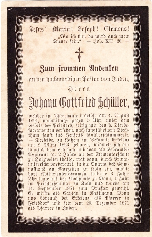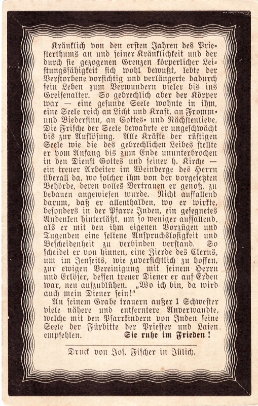 | Langjähriges Siechtum; zunächst als Lehreaspirant 2 J. an der Elementarschule zu Holzweiler; trat dann, durch Privatunterricht vorbereitet, in die Quarta des Gymnasiums an Marzhellen zu Köln; nach Abitur Theologiestudium; Priesterweihe Köln 14.9.1851; Kaplan in Mettmann, Bonn u. Lövenich b. Erkelenz; Pfarrer in Friesdorf; seit 20.12.1871 Pfarrer in Inden; Druck in Jülich |