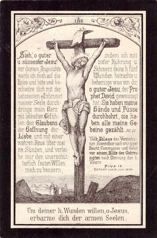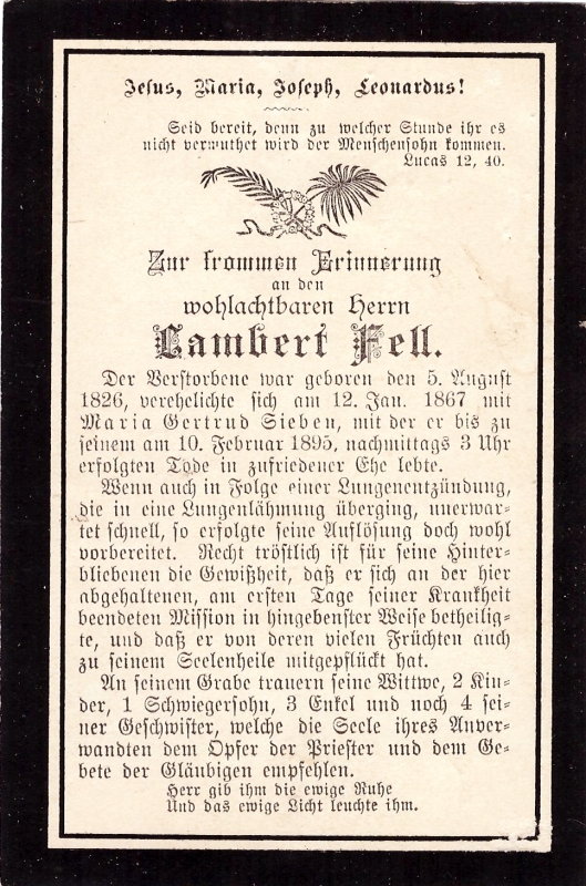 | Wohnort: vermutlich Hilfarth; ∞ 12.1.1867 Maria Gertrud Sieben; Lungenentzündung; 2 überlebende Kinder |