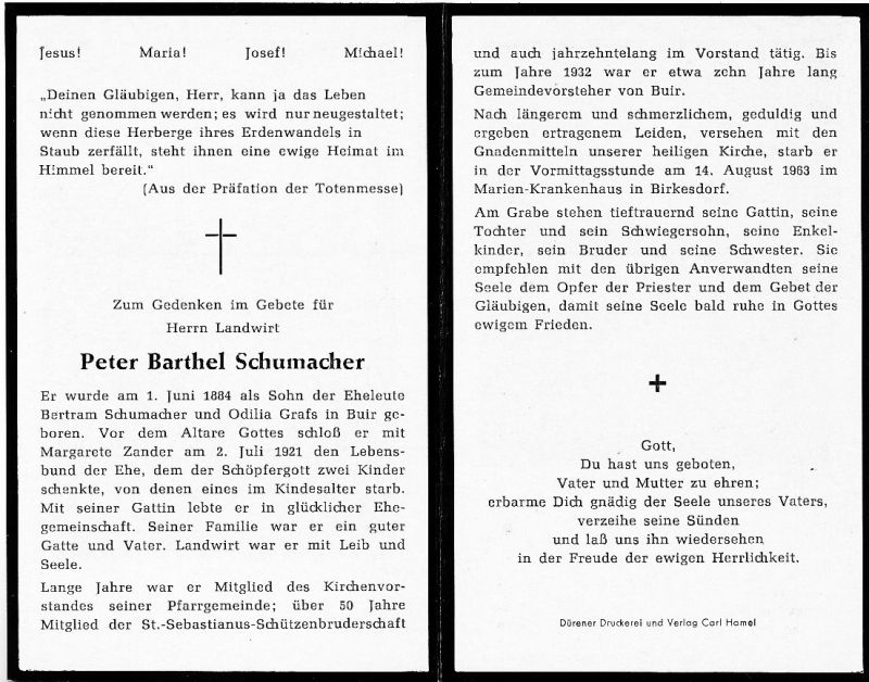 Eltern: Bertram Schumacher u. Odilia geb. Grafs; ∞ 2.7.1921 Margarete Zander; 2 K., davon 1 früh †; Mitgl. Kirchenvorstand u. St. Sebastianus-Schützenbruderschaft; 10 J. bis 1932 gemeindevorsteher von Buir |