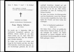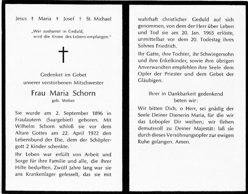 ∞ 22.4.1922 Wilhelm Schorn; 2 K., Sohn Friedrich † Jan. 1945; 12 J. lang ans Krankenlager gefesselt (Buir) |