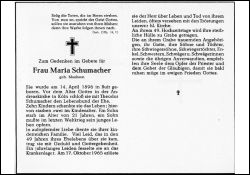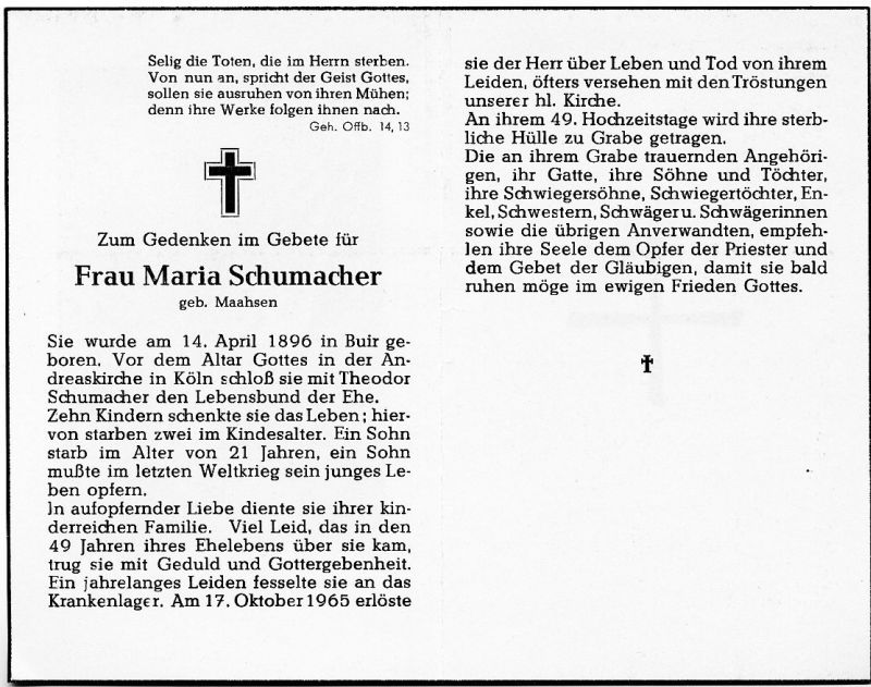 ∞ in Köln Theodor Schumacher; 10 K., davon 2 früh †; 1 Sohn † mit 21 J., 1 Sohn im 2. Weltkrieg gefallen; jahrelanges Leiden fesselte sie ans Krankenlager |