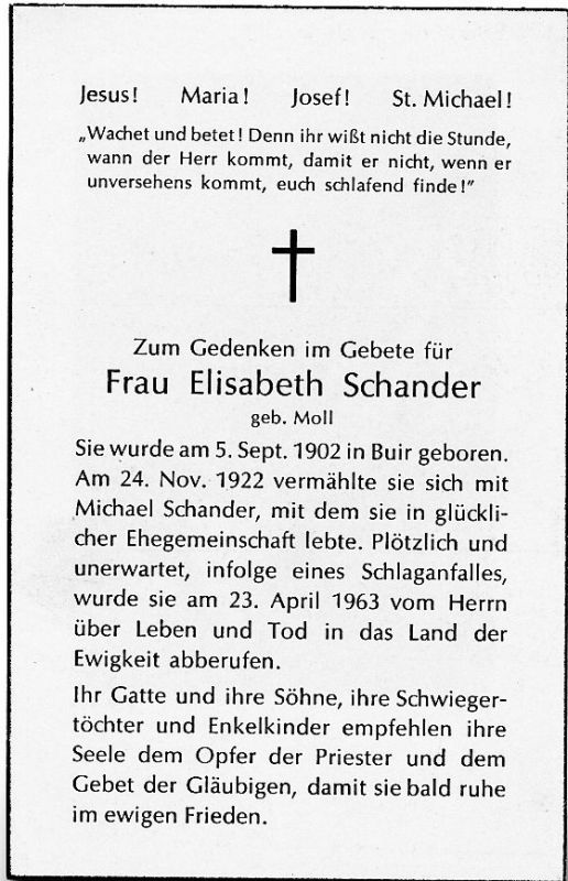 ∞ 24.11.1922 Michael Schander; Schlaganfal; überlebende Söhne (Buir) |