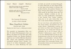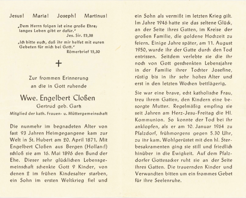 Mitgl. Frauen- u. Mütterverein; ∞ 16.5.1896 Engelbert Cloßen aus Bergen, Holland, † 11.8.1950; 9 K., davon 2 früh †; 1 Sohn im 2. Weltkrieg gefallen, 1 Sohn vermisst; lebte als Witwe bei Tochter Josefine |