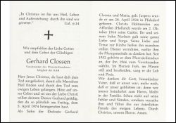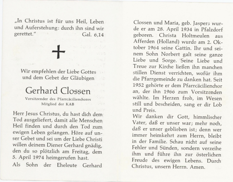 Vorsitzender Pfarrcäcilienchor; Mitgl. der KAB; Eltern: Gerhard Clossen (Cloßen) u. Maria geb. Jaspers; ∞ 2.10.1964 Christa Holtmeulen aus Afferden, Holland; Sohn Norbert; |