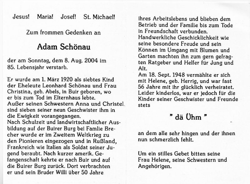 Eltern: Leonhard Schönau u. Christina geb. Abels; von 9 Geschw.leben Anna u. Christel; landw. Ausbildung b. Fam. Brecher auf Buirer Burg; Soldat; danach mit Br.Willi auf Buirer Burg; ∞ 18.9.1948 Helene Herrig |
