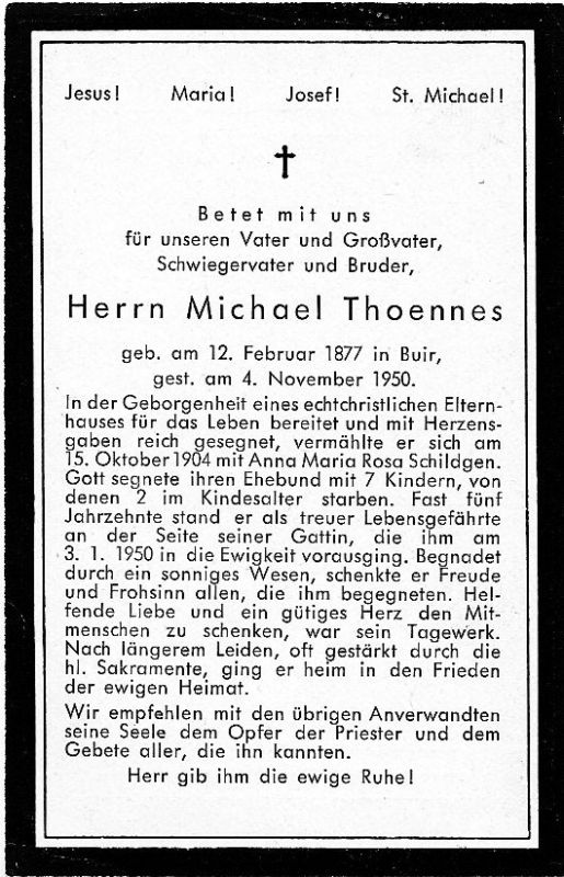 ∞ 15.10.1904 Anna Maria Rosa Schildgen, † 3.1.1950; 7 K., davon 2 früh † (Buir) |