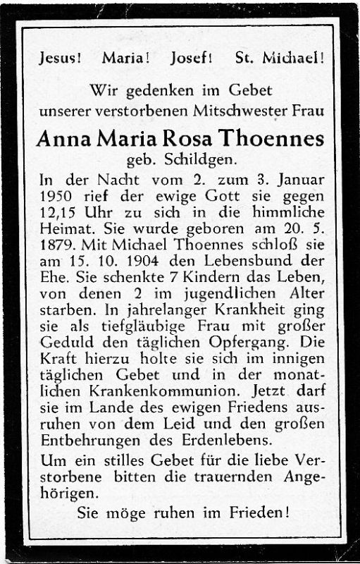 ∞ 15.10.1904 Michael Thoennes; 7 K., davon 2 früh †; jahrelange Krankheit (Buir) |