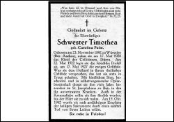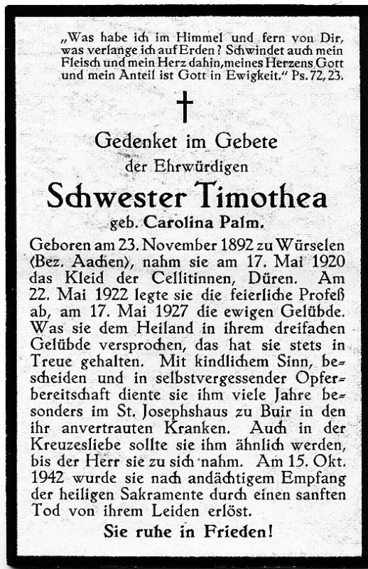 17.5.1920 nahm sie das Kleid der Cellitinnen, Düren; 17.5.1926 ew. Gelübde; viele Jahre im St. Josephshaus zu Buir |