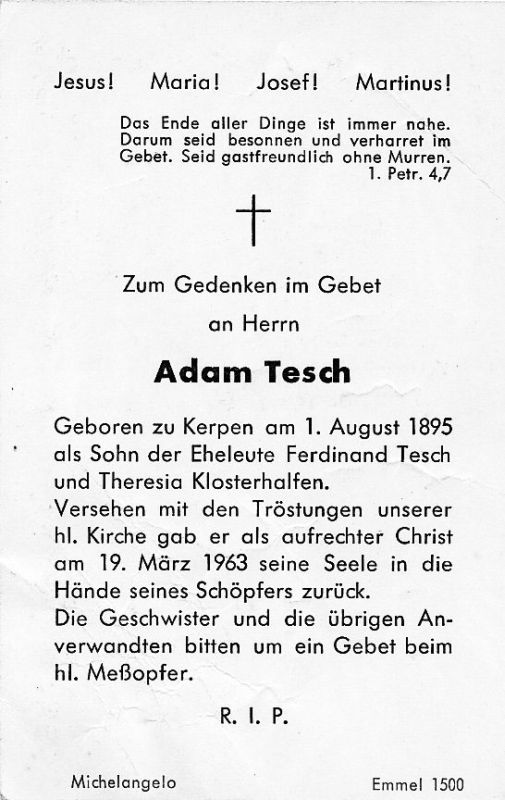 Eltern: Ferdinand Tesch u. Theresia geb. Klosterhalfen (Kerpen)