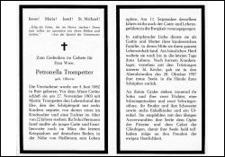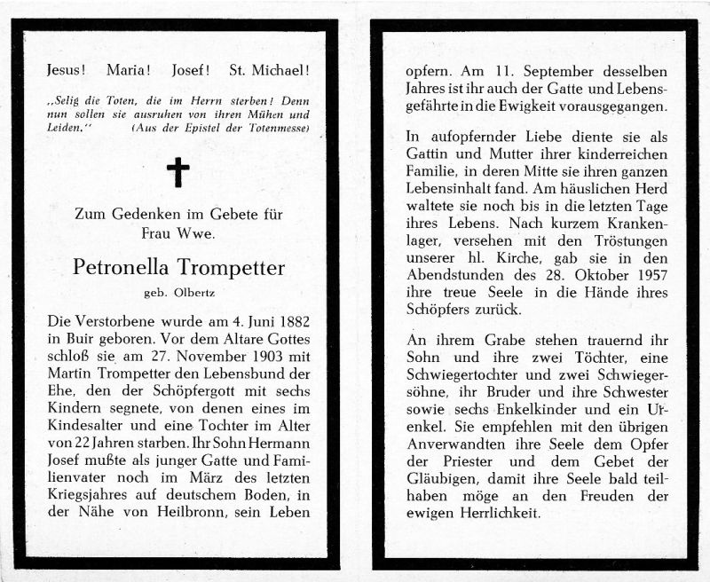 ∞ 27.11.1903 Martin Trompetter; 6 K., davon 1 früh †, T. mit 22 J. †; Sohn Hermann Josef im März 1945 bei Heilbronn im 2. Weltkrieg gefallen (Buir) |