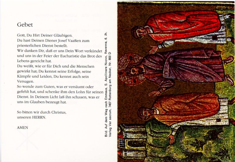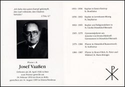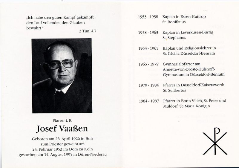 Pfarrer i.R.; Priesterweihe 24.2.1953 Köln; Kaplan 1953 Essen-Huttrop, 1958 Leverkusen-Bürrig, 1963 Düsseldorf-Benrath; 1965-79 Gymnasium D.-Benrath; 1979 Pfarrer D.-Kaiserswerth, 1984-87 Bonn-Vilich |