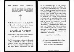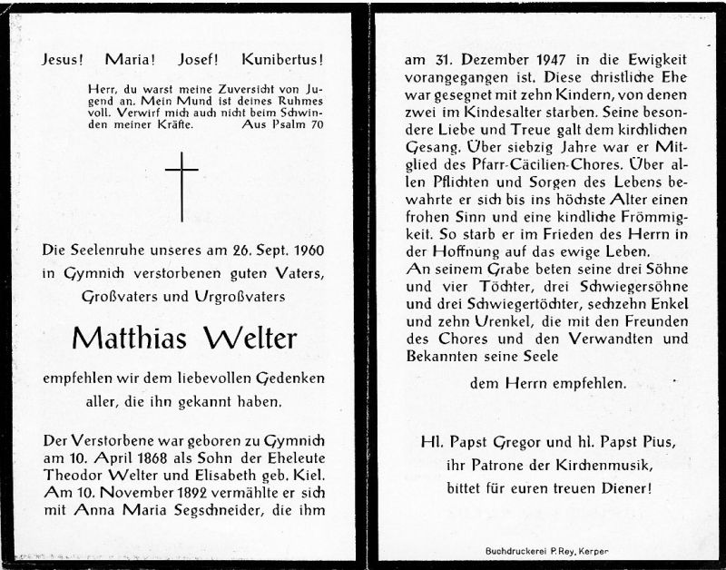 Eltern: Theodor Welter u. Elisabeth geb. Kiel; ∞ 10.11.1892 Anna Maria Segschneider, † 31.12.1947; 10 K., davon 2 früh †; über 70 J. Mitgl. Kirchenchor (Gymnich) |
