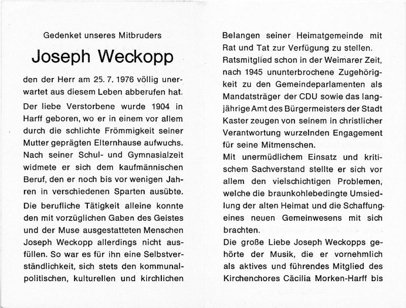 Kaufm. Beruf; langjähriger Bürgermeister der Stadt Kaster; Probleme der braunkohlebedingten Umsiedlung; Mitgl. Kirchenchor Morken-Harff bis Lebensende (Druck in Bedburg) |