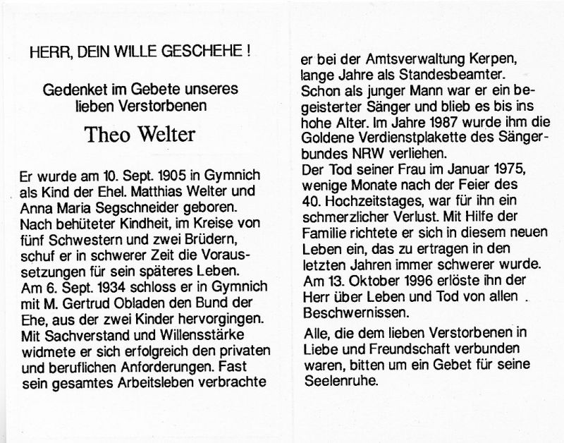 Eltern: Matthias Welter u. Anna Maria geb. Segschneider; ∞ 6.9.1934 in Gymnich Gertrud Obladen, † Jan. 1975; 2 K.; tätig b. Amtsverwaltung Kerpen, lange J. Standesbeamter; begeisterter Sänger |