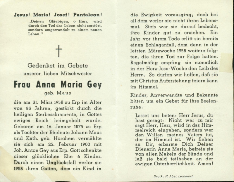 Eltern: Johann Maus und Katarina Horchem; ∞ 25.2.1900 Johann Anton Gey aus Erp † 1928; 6 K. |