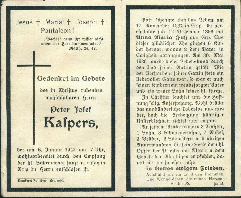 ∞12.12.1896 Anna Maria Fuß aus Erp † 30.5.1936; 6 K. davon 2 † |
