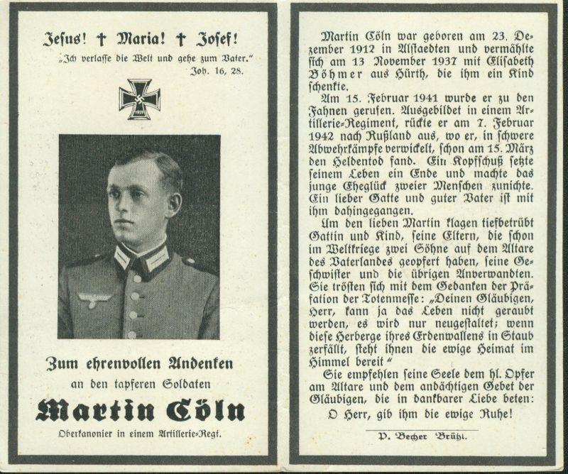 ∞ 13.11.1937 Elisabeth Böhmer; 1 K.; Gefallener 2. Weltkrieg |
