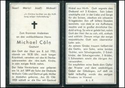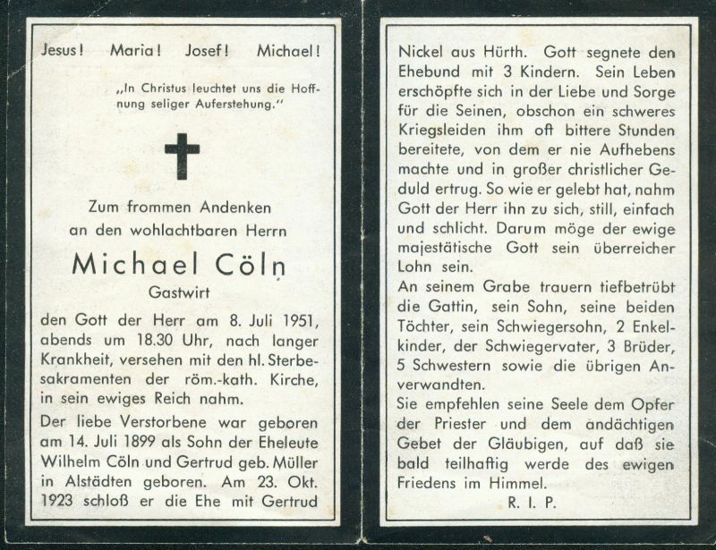 Gastwirt; Eltern: Wilhelm Cöln u. Gertrud Müller; ∞ 23.10.1923 Gertrud Nickel aus Hürth; 3 K. |