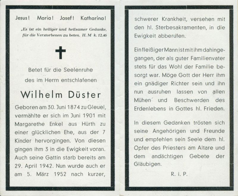 ∞ 6.1901 Margarethe Enkel aus Hürth † 29.4.1942; 7 K. davon 3 † |