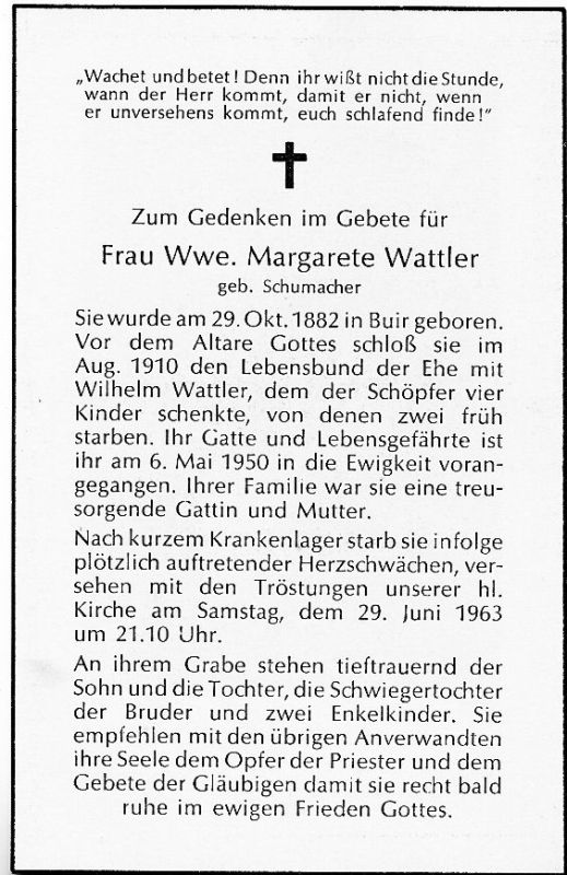 ∞ Aug. 1910 Wilhelm Wattler, † 6.5.1950; 4 K., davon 2 früh † |
