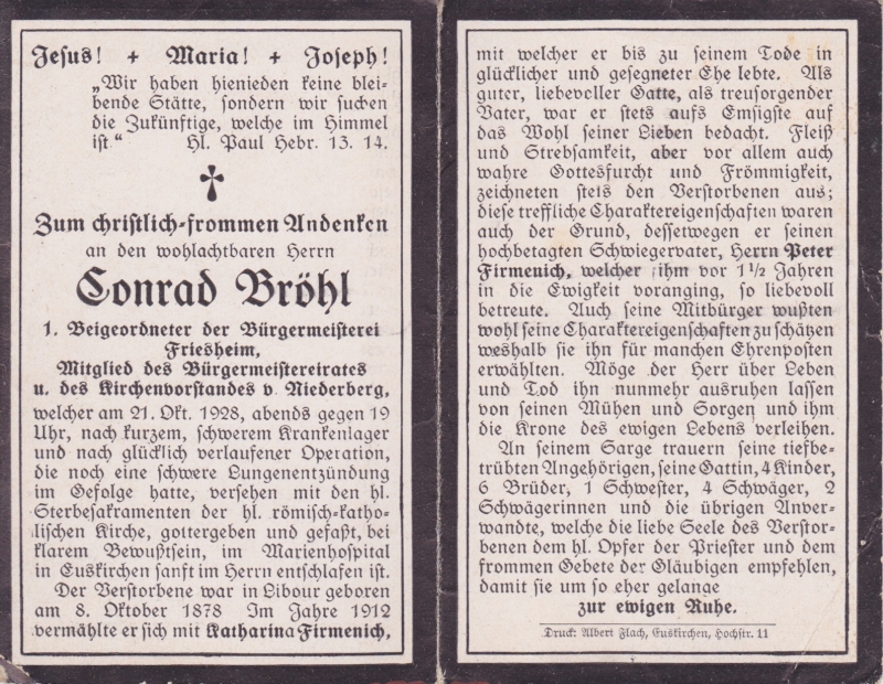 | 1. Beigeordneter Bürgermeisterei Friesheim; ∞ 1912 Katharina Firmenich, 4 K.; Mitgl. Bürgermeisterrat u. d. Kirchenvorst. Niederberg |
