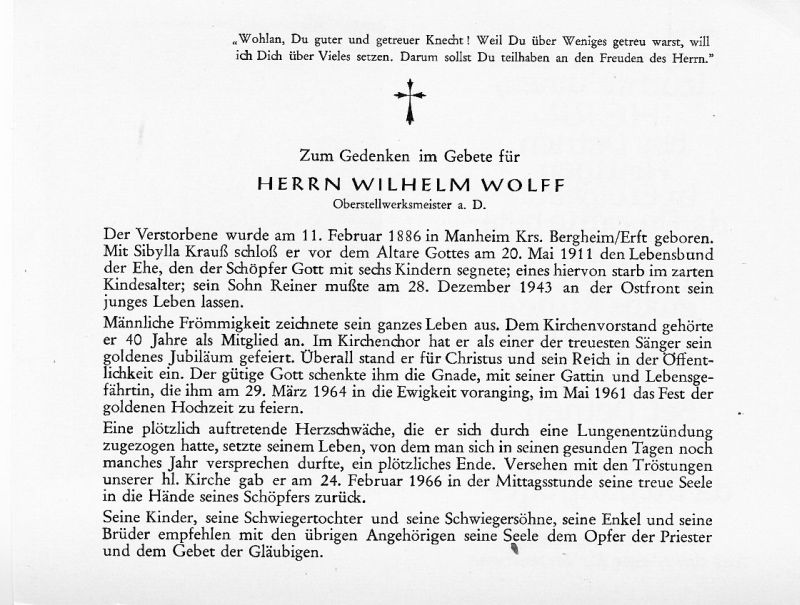 ∞ 20.5.1911 Sibylla Krauß, † 24.2.1964; 6 K., davon 1 früh †; Sohn Reiner 28.12.1943 im 2. Weltkrieg (Ostfront) gefallen; 40 J. Mitgl. Kirchenvorstand; Mitgl. Kirchenchor; 1961 Goldhochzeit |