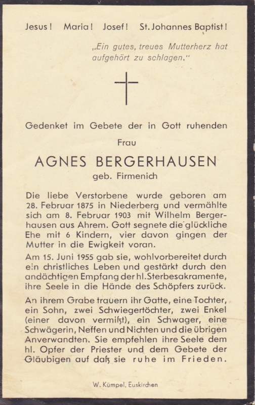 | ∞ 8.2.1903 Wilhelm Bergerhausen aus Ahrem, 6 K. davon 4 † |