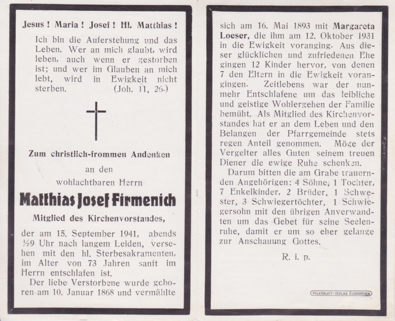 ∞ 16.5.1893 Margareta Loeser 12.10.1931 †; 12 K. davon 7 †, Mitgl. Kirchenvorstand; Druck i. Euskirchen |