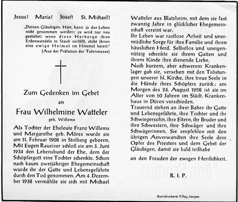 ∞ 3.6.1934 Eugen Raueiser, n. kaum 2 J. †; 1 Tochter; ∞ 4.12.1938 Michael Watteler aus Blatzheim (Buir) |