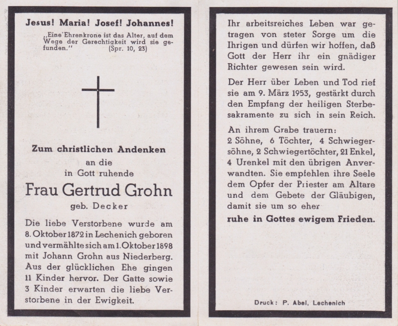 ∞ 1.10.1898 Johann Grohn aus Niederberg †; 11 K. davon 3 † |