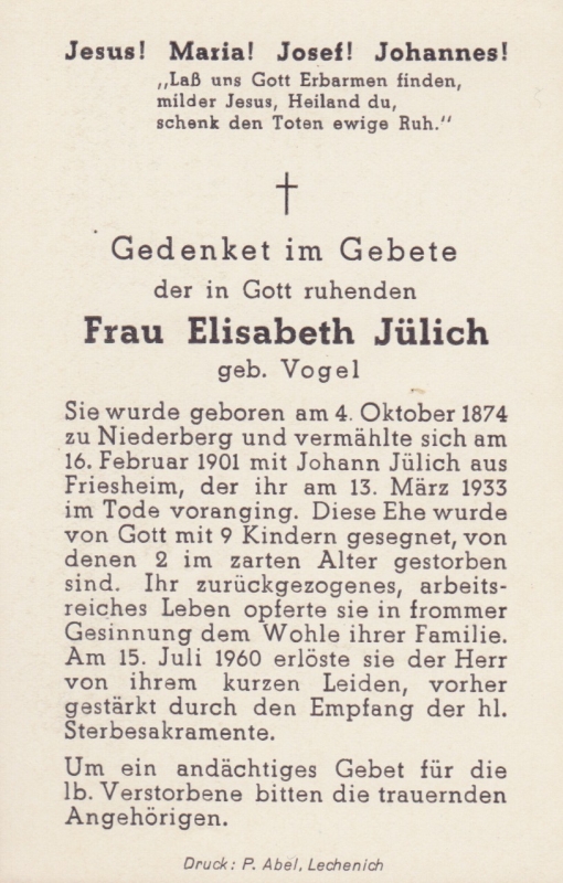 ∞ 16.2.1901 Johann Jülich 13.3.1933 †; 9 K. davon 2 † |