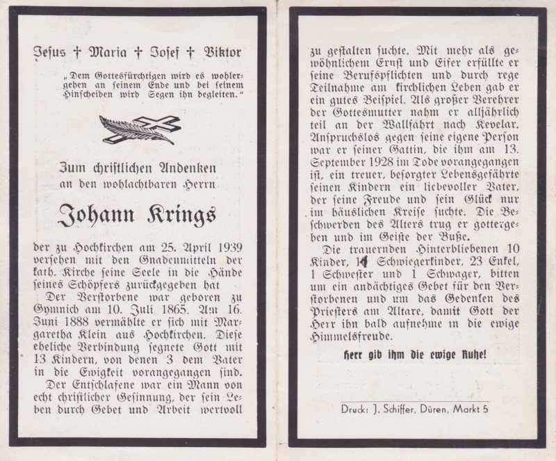 ∞ 16.6.1888 Margaretha Klein aus Hochkirchen 13.9.1928 †; 13 K. davon 3 † |