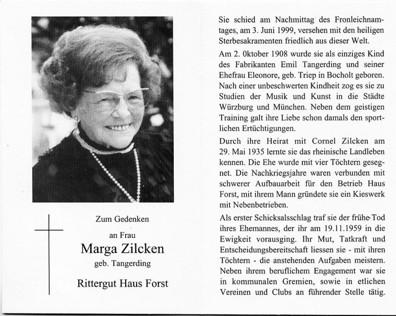 Eltern: Fabrikant Emil Tangerding u. Eleonore geb. Triep; Kunst-/Musikstudium (Würzburg, München); ∞ 29.5.1935 Cornel Zilcken, † 19.11.1959; 4 Töchter; neben Betrieb Haus Forst Kieswerk gegründet; 2 T. † |