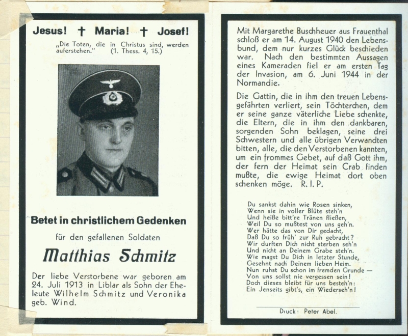 | Eltern: Wilhelm Schmitz und Veronika Wind; ∞ 14.8.1940 Margarethe Buschheuer aus Frauenthal; 1 K.; Gefallener 2. Weltkrieg |