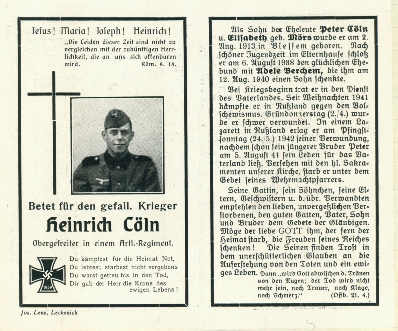| Obergefreiter Artillerie; Eltern: Peter Cöln und Elisabeth Mörs; ∞ 6.8.1938 Adele Berchem; 1K.; Gefallener 2. Weltkrieg |