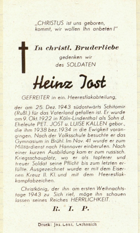 | Gefreiter: Eltern: Peter Jost und Luise Kallen; Gefallener 2. Weltkrieg |